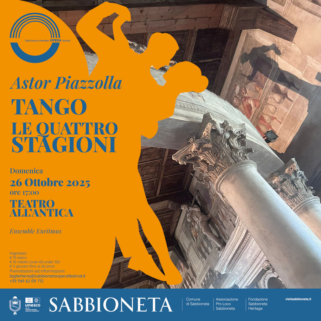 Nel contesto della prestigiosa rassegna la città ideale ospiterà due eventi di grande fascino: venerdì 24 ottobre 2025 alle ore 20.45, nella Chiesa della Beata Vergine Incoronata, il pubblico potrà assistere allo “Stabat Mater” di Alessandro Scarlatti, eseguito dalla Venice Chamber Orchestra diretta da Marco Bisi, con le voci del soprano Costanza Cutaia e del contralto Alessandra Visentin. La musica proseguirà domenica 26 ottobre 2025 alle ore 17.00, quando il Teatro all’Antica di Sabbioneta accoglierà il concerto “Tango e le Quattro Stagioni” di Astor Piazzolla, interpretato dall’Ensemble Euritmus, un viaggio tra la passione del tango e la forza delle stagioni dell’animo umano.